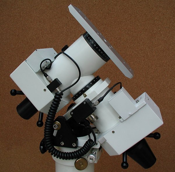 Die Montierung ist vorbereitet zum Einbau von Winkelencodern (Typ Megatron MOM20). Diese sind in einem Aluminiumgehäuse mit Spann-Exzenter untergebracht. Die 5mm Welle ist doppelt kugelgelagert und über einen Flachriemen mit den Hauptachsen verbunden.